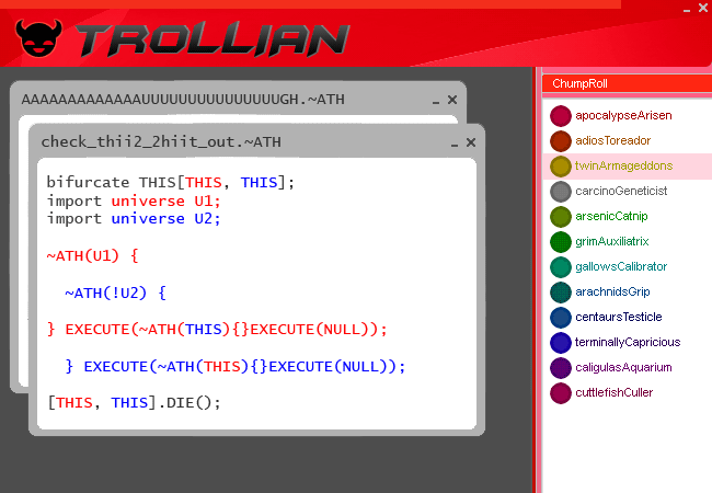 While you would LOVE to do that, you have NO CLUE how this shit works. So instead of working on it, you decide to take a quick look at your friend's code. Shit for brains doesn't even know what's coming. Oh and you guess you might as well EXECUTE the code while you're at it just to rub in the fact you're clearly IGNORING HIM.
