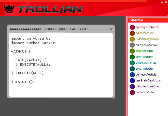 Your name is KARKAT VANTAS. And somewhat related to you are your INTERESTS. As mentioned, you have a VARIETY of very niche interests. You, ironically, have a passion for HOMESTUCK along with HIVESWAP and BROADWAY KARKAT. In fact you should feel EMBARRASSED and ASHAMED by this fact but for some reason you are not. You also tend to dabble in PSYCHOLOGICAL HORROR, namely THE MANDELA CATALOGUE, as well as other derivatives, even though you are secretly a fucking COWARD. As a result of this, you enjoy spending your time alone DRAWING or PLAYING GAMES on your computer. When you're not doing that, you waste your time WATCHING SHOWS, most of which being animations such as Epithet Erased or more embarrassingly Adventure Time and OK KO.Your enjoy chatting with your FRIENDS despite NOT HAVING ANY SOCIAL SKILLS whatsoever. This, however, does not stop you from being LOUD and ANNOYING all the time. And to your benefit, you have a wide array of ALTERNATE ACCOUNTS to pester all of your friends from and potentially others. Your trolltag is carcinoGeneticist and you speak in a manner that is ALMOST EXCLUSIVELY ORNERY, ALL THE TIME.